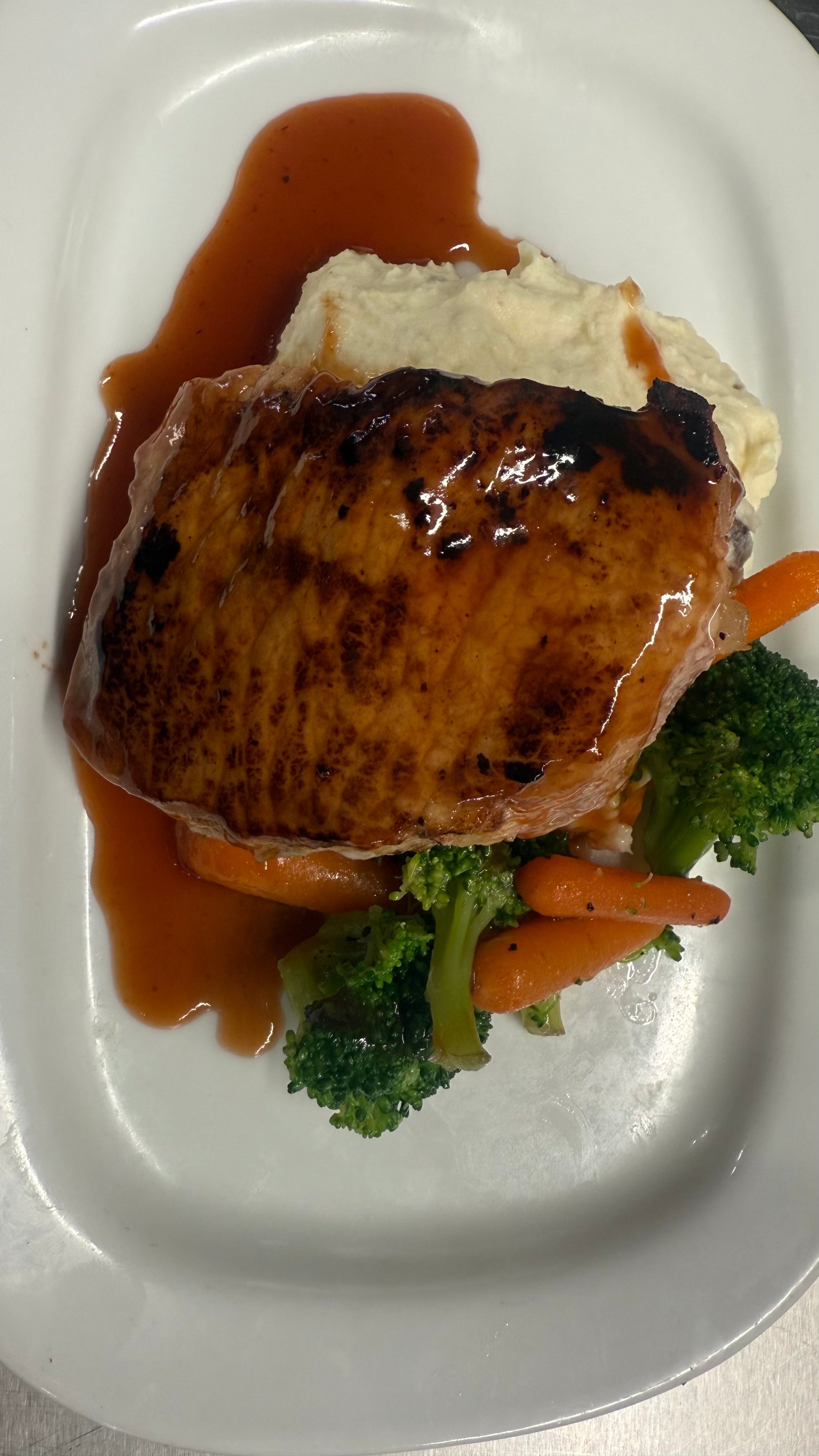 Orange Barbeque-Glazed Porkchop with Mashed Potatoes and Steamed Carrots and Broccoli